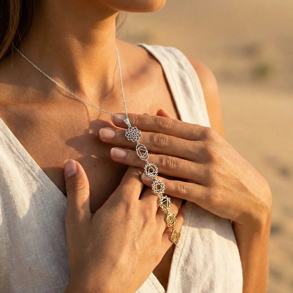 The Ascension Line Necklace features all seven sacred chakra symbols aligned from root to crown — representing stability, creativity, confidence, love, expression, intuition, and spiritual connection.